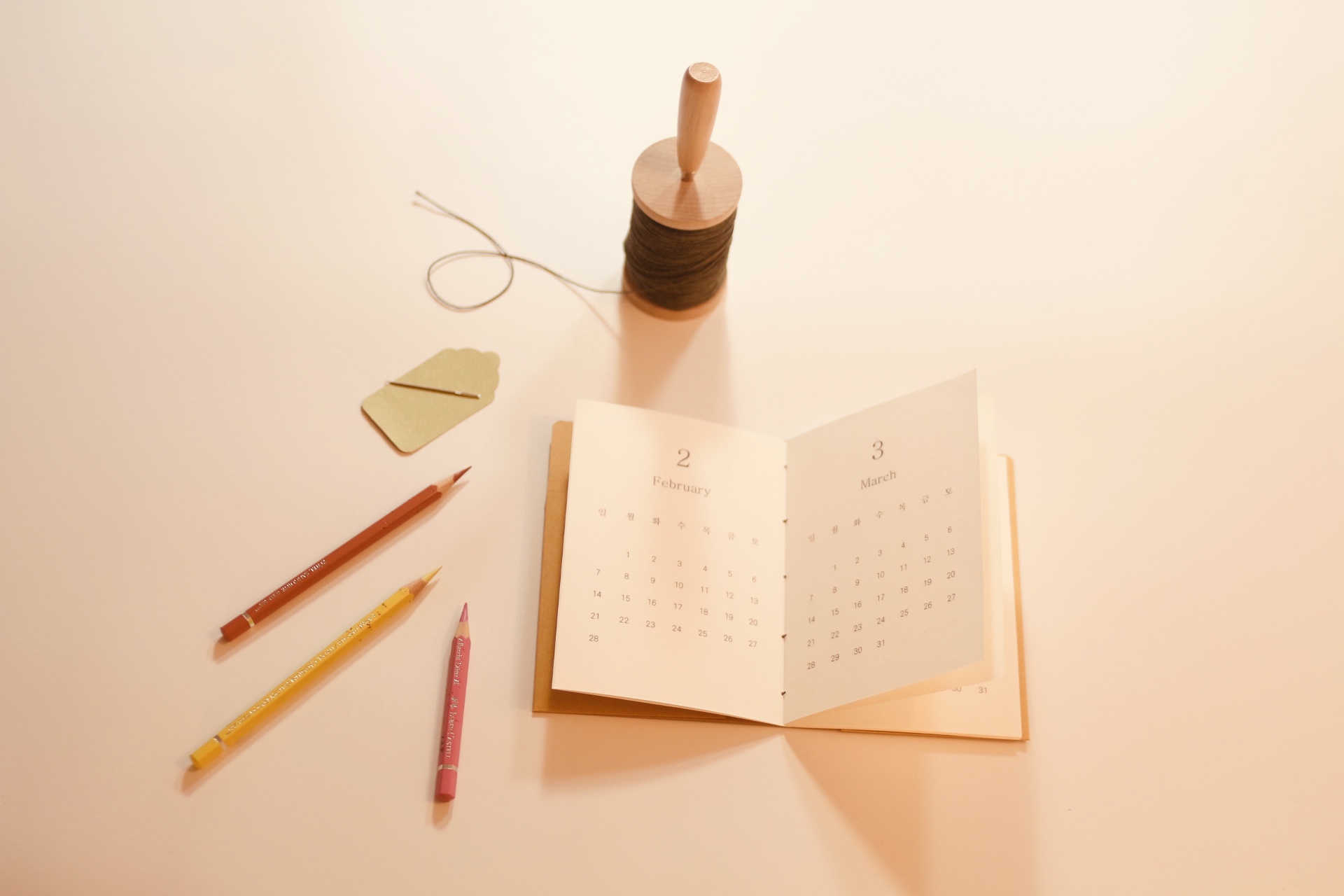 2021년 새해 달력을 차분한 겨자색 커버와 함께 바느질해서 완성한 달력 노트에요.